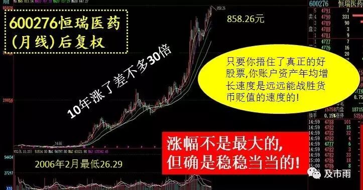 真正的长牛复合大收益的不仅仅是茅台,白药,还有类似恒瑞医药这样的,恒瑞几乎是让人忘记的品种,很少人去长捂,这个我讲了很多次了,人性的短板使然,因为恒瑞也跟白药一样历史上拉个涨停都很少见到,但是它的涨幅会小吗?10年也涨了30来倍啊,就算这10年一线城市房价涨了10倍,但如果你10年前26万元恒瑞放着不懂,现在也有858万啊,你看看下面这张图就知道了: