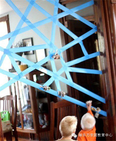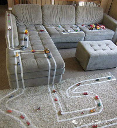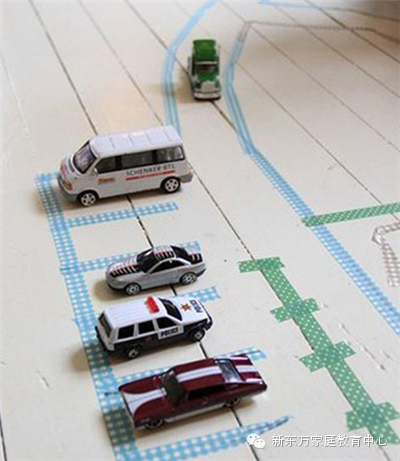 14、胶带通路:这个玩法依然与胶条有关,找一个家里的过道,将胶条悬空随意贴成若干轨迹,孩子们将手中的小车或者小人偶扔出,如何能让它们通过障碍而不被粘住,要考验小朋友的手眼协调能力了,哈哈,这个游戏是不是让成人也很心动?