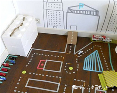 13、胶条游戏场:胶条真真是个好工具,这样的游戏空间能让孩子们玩很久,玩具并非昂贵就是好的,让孩子自己来创造游戏空间,该是多么有意义的一件事!小提示:可以选择布面胶带,比较容易清理。