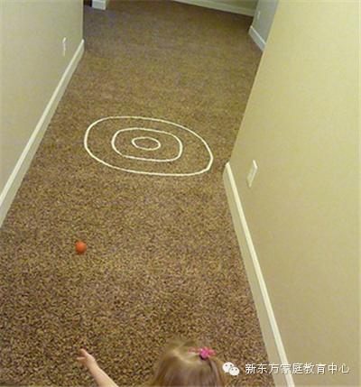 19、推球游戏:在地板上设置一个区域做为目的地,让孩子在一定距离外用小手将小球推动,看看小球能否停留到目的地,可以将目的地分区域设置得分,全家一起来玩,看看最后谁的得分最高。