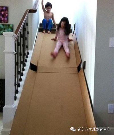 2. 纸箱滑梯:家里有楼梯的可以试下这个玩法,孩子们一定 乐此不疲!