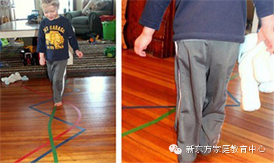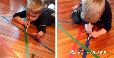 16、行走轨迹:依然是胶条,父母在地板上贴出任意的几条路线,让孩子们按照轨迹去行走,可以培养他们的平衡能力哦,大一点的孩子可以用吸管吹球,让小球按照轨迹行进,也是非常好玩的游戏。