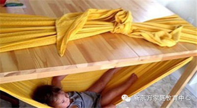 20、桌子摇椅:这个聪明的玩法小孩子的父母可以借鉴,床单+桌子就是孩子天然的摇椅,乐趣十足。