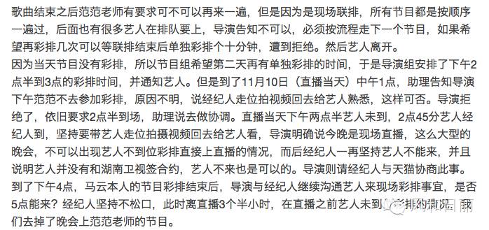 1,「现场表示只能唱歌不能配合表演」,单纯从明星发展的战略层面来看,经纪团队是无能的,昨晚双11最大亮点就是明星带着表演来植入品牌信息,范玮琪的经纪团队如果清楚双11晚会的真正意义(表演+电商流量),那么就应该让明星积极配合节目组的安排。因为这个平台不仅仅是芒果的,更是天猫的,天猫后面有多少个广告主盯着,昨晚双11晚会就是广告主选明星代言的黄金海选现场呀。退一万步说,芒果台安排的表演又不是脑残,又不是毁明星形象的哦,为何要摆谱呢。