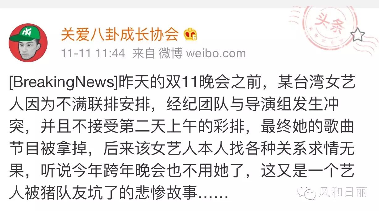 哎呀,no zuo no die的范玮琪以及其公关团队,今天上头条想必大家都知道来龙去脉了。「关八」昨晚就爆料了,原本范玮琪是在之前芒果双11晚会的名单上的,但是直播过程中就没有出现,风和君之前看的名单好像是晚上11点多出场,原来的出场顺序还不错的呢~