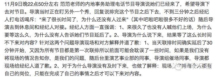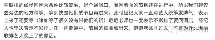2,专业的活动执行经验:做过活动,尤其是电视大型节目的童鞋们都很清楚,所有提前计划好的流程表(rundown)都只是理想状态下的安排,现场一定是要跟着当下的实际情况走的。关于这一点,明星团队和电视台都要保持好一定的默契,也要适应,这是圈中的常规,没有一场晚会的彩排都是按照原定计划走的。就像拍戏一样,不管你多大牌,永远要等,这是娱乐圈的一个习惯性动作。在等待的过程中,如果范玮琪团队有怨言,请不要指挥着下面的小助理来回跑腿传递消息,经纪人要不要看看整个节目现场,要不要感受下芒果的娱乐功力,见识多了,才能知道现在的娱乐新规则?在所有活动面前,演员只是一砖一瓦,一台大型晚会是一个庞大的团队合作,没有合作精神的人,是可以分分钟出局的。