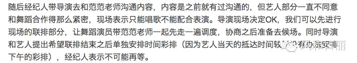 2,「经纪人表示不可能再等」,请范玮琪的公关团队放弃「一切以明星为中心」的过时概念,请明星积极展现一些团队合作精神。芒果台的晚会也是一个名利场,虽然幕后故事不会直播,可是幕后的一切都可以是未来合作的基础。而且风和君相信芒果台带明星的经验,这么多年的明星合作,自然彼此间都是有默契的。有问题,一定可以充分沟通,但是一味的单方面强势,是自毁前途呀~