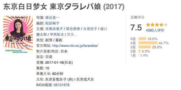 豆瓣评分7.5。如果你喜欢都市恋爱系日剧,如果你喜欢现实又不残酷的爱情片,不妨去看看这部剧。