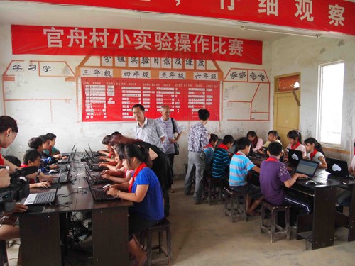 我们在视察官舟村小的电脑学习使用情况