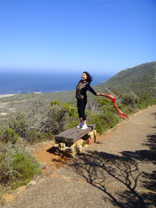 我站在好望角角上的平台拍照,狂风吹乱了我的头发,我干脆带上了我事先准备好的红沙巾。这里10米的浪常见,一年有三分之一多的时间见6-7米的浪,我向正南方的大浪望去看到一处一直地翻着浪花,导游说,很多巨轮在那里触礁之地,300多年来,很多国家有10艘以上的巨轮永远葬在了那里。
