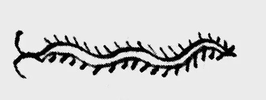 今晚看到一只有荧光的蠕虫或者是千足虫,以前从来没有看到或者听说过这种东西。我出门走到草坪的时候注意到某种荧光,这荧光是一长条,一直在变粗。我从没见过会在身后留下荧光的萤火虫。我用手电筒四处寻找,最后发现一条细细长长、蠕虫一样的东西,身体两侧长了许多细脚,头上还有两只触角一样的东西。它的完整体长在1.25英寸左右。我抓住了它,用试管装了起来,但它的荧光很快消失了。淡黄色,扭来扭去的(腿比我画的要细)。