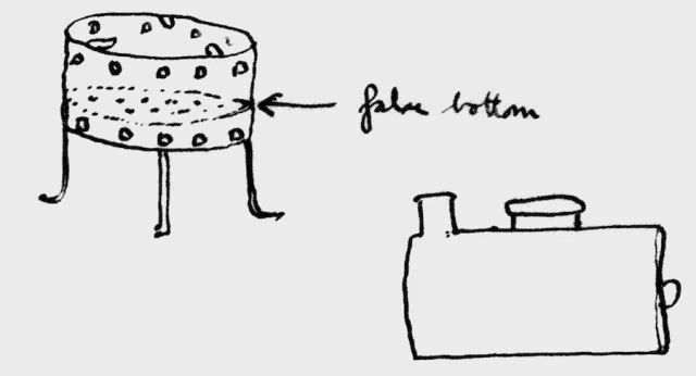 当地(马拉喀什)广泛使用的炭盆用来烧饭还是相当不错的。它们通常1英尺宽,8英寸深,有的在侧壁上开了许多小孔,有的用的是双底,上面的底板上开了小孔。木炭只要很少的纸,木头和火种就能点燃,能烧上几个小时;拉几下风箱就能把炉温提到很高。在炭盆上放个小锡烤箱,就能很好地烤制食物。