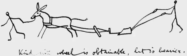 这里(马拉喀什)用的耕犁有一根横杆,从两头耕畜的肚皮下方穿过,上面系着轭——公牛用的是木轭,马用的是麻袋布。公牛、骡子、马匹甚至驴子都可以用来拉犁。两种动物有时候被套在一起拉犁。