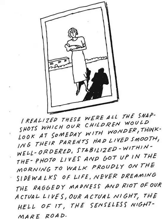 “I realized these were all the snapshots which our children would look at someday with wonder, thinking their parents had lived smooth, well-ordered lives and got up in the morning to walk proudly on the sidewalks of life, never dreaming the raggedy madness and riot of our actual lives, our actual night, the hell of it, the senseless emptiness.”