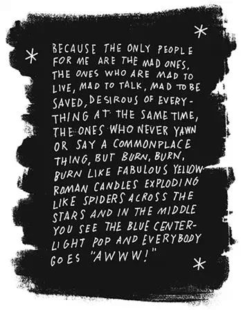 “the only people for me are the mad ones, the ones who are mad to live, mad to talk, mad to be saved, desirous of everything at the same time, the ones who never yawn or say a commonplace thing, but burn, burn, burn like fabulous yellow roman candles exploding like spiders across the stars.”