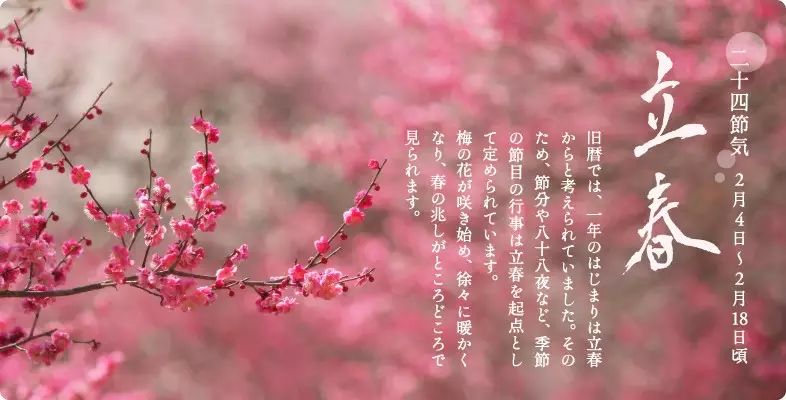 春天的到来即立春(“立春”或“节分”)被指定在新年第二个月份的第三或者第四日。立春的纪念活动有些在二月三日或四日举行,虽然这个时候刚好是日本最冷的冬日。