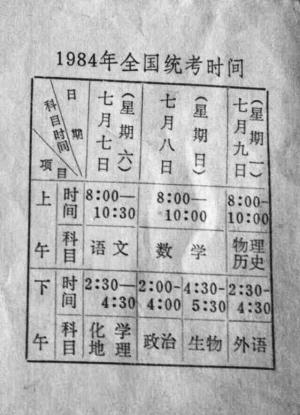 杭二中校友群,有人晒了一张照片,拍的是1984年全国统考时间表。那时高考有三天,7月7日上午考语文、下午考化学地理;7月8日上午考数学、下午政治生物分开考;7月9日上午考物理历史、下午考外语。
