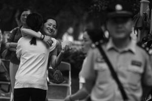 杭十四中考点,老师给考生拥抱鼓励。 记者 陈中秋 摄