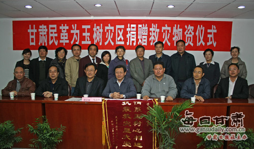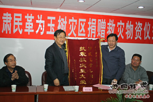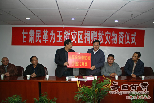每日甘肃网青海讯(记者莫兴邦 团结报记者魏娜 董小平)4月24日中午,甘肃民革支援玉树灾区物资车队抵达西宁,民革甘肃省委会向玉树灾区捐赠款物合计30万元,青海省民政厅专门致信表示感谢。在民革青海省委机关随即举行的甘肃民革为玉树灾区捐赠救灾物资仪式上,民革甘肃省委会主委郭层城亲自将捐赠善款交给民革青海省委员会主委马志伟。
