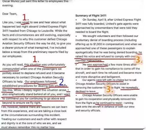 2.没觉得自己错。“our employees followed established procedures for dealing with situations like this”(我们的员工处理这次事件的程序是完全没问题的)