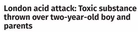 据英国广播公司(BBC)消息,当地时间4月8日下午,来自中国的一家三口于伦敦北部Islington地区遭泼酸性物质,造成男性受害者脸部大面积“无法复原性腐蚀”,妻子及2岁的儿子不同程度受伤。