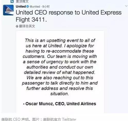 几小时后,该航空公司的首席执行官奥斯卡•穆诺兹(Oscar Munoz)发表道歉,称这是“一起令全体美联航员工感到不安的事件”,一项“详细审议”正在进行中。他还表示:“我们正在接触这名乘客,与他直接对话,进一步处理和解决这一问题。”