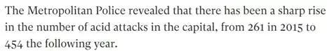 据警方数字,伦敦的硫酸袭击呈现快速上升趋势,已从2015年261件升到2016年454件。