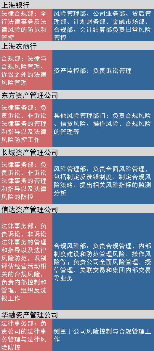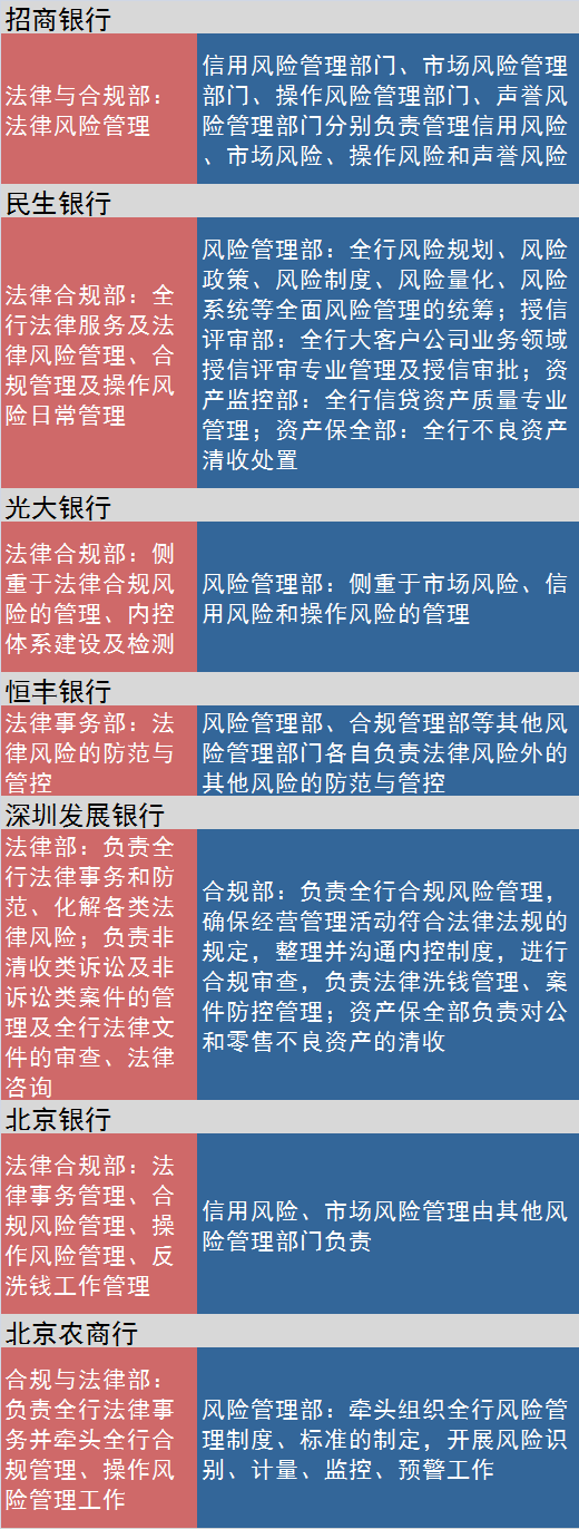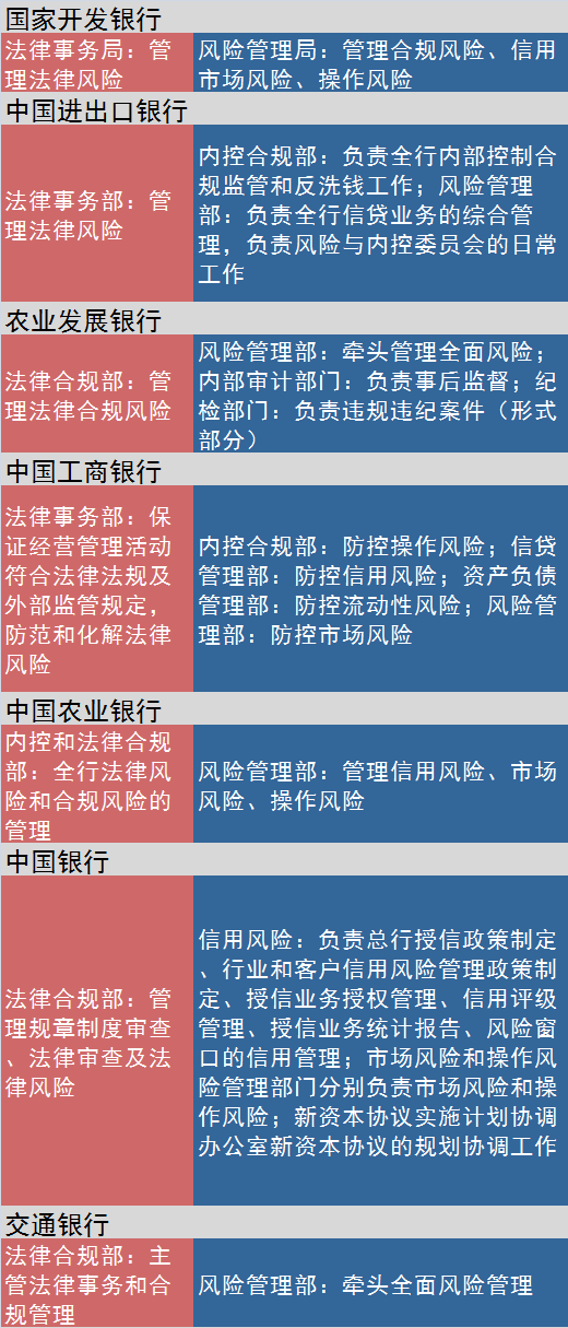 表一:银行法律部门与其他风险管理部门职责划分情况表