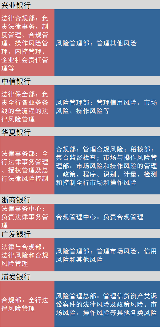 法律风险是银行业机构的风险之一,除此之外,还包括合规风险、信用风险、市场风险、操作风险等,有的银行将法律风险与合规风险统一称为法律合规风险,由一个独立的部门负责,有的银行将法律风险与合规风险分别设置不同的部门进行管理。