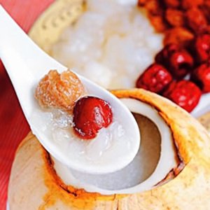 椰子性味甘,果肉具有补虚强壮,益气祛风的功效,久食能令人面部润泽。民间有“要使皮肤好,粥里加红枣”之说。红枣中大量的维生素B可促进皮下血液循环,使皮肤和毛发光润,面部皱纹平整,皮肤更加健美。每年的秋季,正是雪蛤储存能量准备冬眠的时候,也是雪蛤生命力最强之时,尤其是雌雪蛤的输卵管(雪蛤膏)更是聚集了来年繁殖后代的所有营养,此时的雪蛤,其滋补功能更是无与伦比。其性味咸平,不躁不火,含有大量的蛋白质、氨基酸、各种微量元素和少量有益人体的激素,尤其适合作为日常滋补之品。