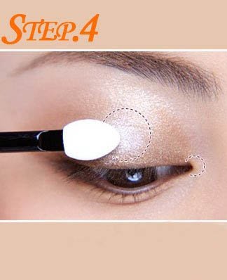 以小海绵刷沾取提亮粉末后,在上眼皮中心处以化圈方式层叠。若要使眼白看起来更澄澈,可在眼头处稍作点缀。