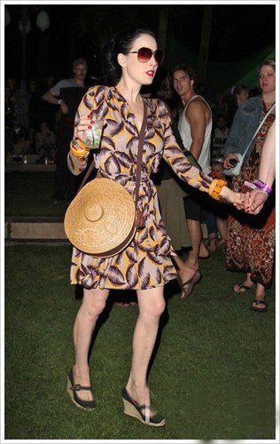 一些人生中不能没有高跟鞋的女生,可以选择坡跟鞋作为出行的鞋子,既舒服又有海拔,何乐而不为呢?Dita von Teese整个一身就是简约舒适田园风,印花连衣裙、编制草包,再穿上牛仔布面的坡跟鞋,带着一种随性、原始的舒适。
