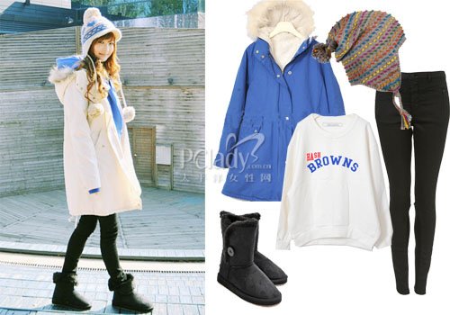 普蓝色长款棉服外套有着非常靓眼颜色效果,内搭白色卫衣、普蓝色LOGO,格外附有层次。雪地靴与同色Skinny穿搭会有沿长双腿效果哦。