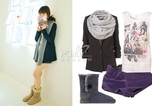韩版西服外套衣中长款最受欢迎,同样可以穿出休闲混搭味儿。深紫外套搭紫罗兰休闲短裤,两件长度刚刚匹配。拉长深深,自然流畅显腿型。内搭T-Shirt显层次,灰色围巾与雪地靴头角呼应。