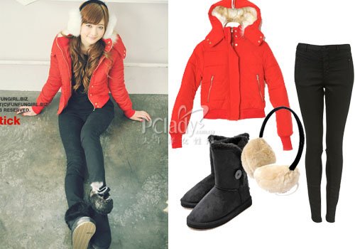 红色短款羽绒服+黑色雪地靴+黑色Skinny,缩短上身比例,拉长双腿效果绝对明显,色块清爽又简单。