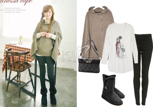 斗篷衫独特结构最保险搭配莫非雪地靴。膨胀上身,单独整色快都是斗篷特色。为避免花俏另类装扮,选择黑色小脚裤与同色雪地靴,就可以穿出韩国MM风范。小巧可爱气质的你绝对抓人眼球。