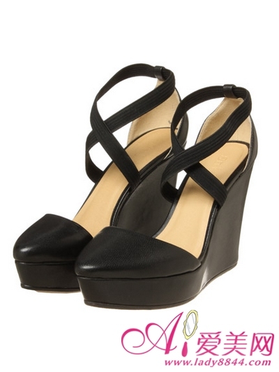 优雅的黑色坡跟鞋设计,脚踝交叉弹力带设计,看上去有种复古英伦风格。