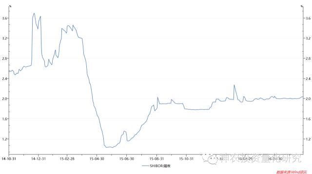 首先,央行在这个位置并不具有进一步放水的动力。自从SHIBOR隔夜利率在2015年5月份见底之后,我们现在再也没有看到利率的进一步下行,而是在当前的这个位置稳住。这表明央行并不想进一步放水刺激国内资产的上行,仅仅试图保持当前较为稳定的宽松环境。