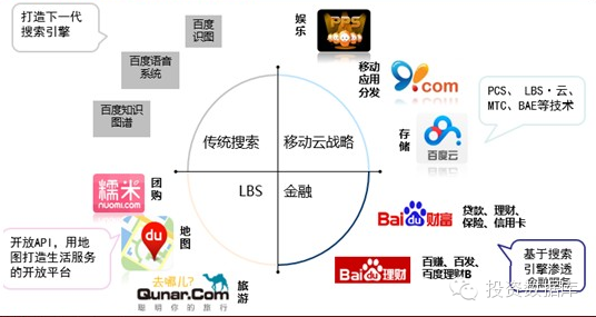在2013年,百度围绕移动、O2O和LBS生活服务共投入30亿美元,进行了超过17起投资,百度的主要布局在移动云平台、LBS平台、金融平台及移动搜索平台战略。从去年大手笔收购91无线来看,百度已补齐了移动应用的短板,建立了移动搜索与应用商店相结合的分发模式;