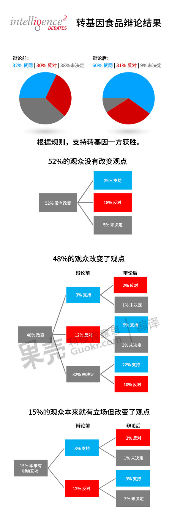 最终的结果也十分有趣。虽然科学事实并非一人一票决定,但科学影响政策也需要通过正规的议政流程实现,因此考虑科学传播的效果是十分有意义的。在这场辩论中,有近一半的观众因为辩论而改变了看法,但大部分是此前的中间派。开场30%的反对派中,9%转为了支持;32%的支持派中2%转为了反对;但38%的未决定派中,22%转为支持、10%转为反对。这可能表明,改变业已形成的观点并不容易,仅从科学传播的效果而言,面向中间派也许是最好的策略。