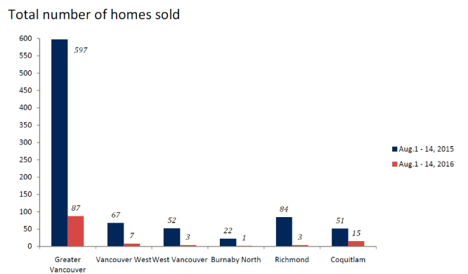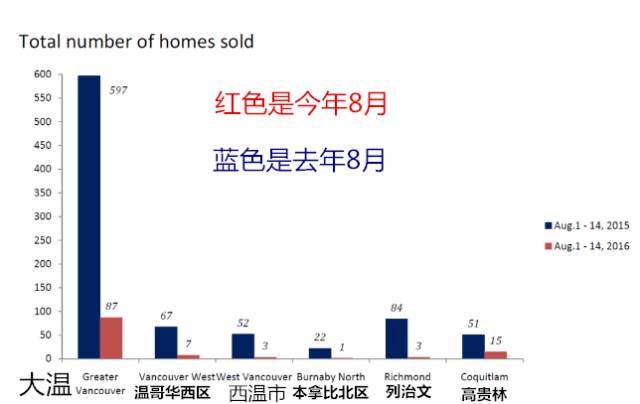 从8月1日到14日,西温哥华地区只有3套房屋出售,去年同期是52套,同比跌幅高达惊人的94%。除了西温哥华,列治文地区销售暴跌96%,北本拿比地区跌幅为95%。