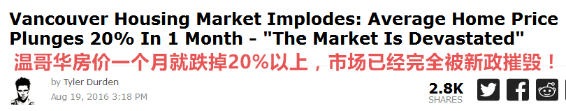 Tyler Durden 的评论文章标题直接为:"温哥华房价一个月就跌掉20%以上,市场已经完全被新政摧毁!"