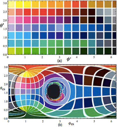 冯·藤泽尔曼做了一个巧妙的演示。她建立了一个多色的平面圆环代表吸积盘,然后把它放在旋转的黑洞的外周。