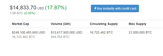 比特币价格在12月6日首次突破1.2万美元关口后,又接连突破1.3万美元和1.4万美元两道关口,行业网站CoinMarketCap的数据显示,比特币价格为14833.7美元,涨幅为17.87%。