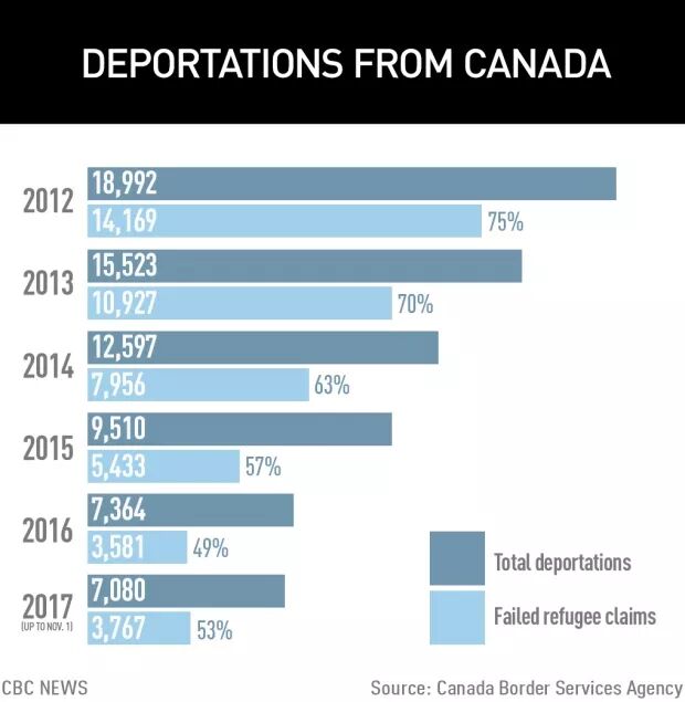 数据显示,加拿大过去5年来被遣返总人数已大幅下降,从2012年的18,992人下降至去年的7,364人。