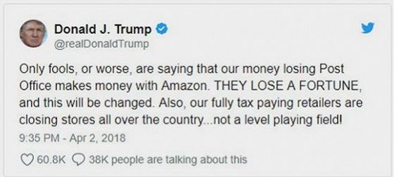 然而亚马逊的“好日子”,随着美国总统特朗普对它的密切关注,似乎就要走到尽头了。一周以来,特朗普五度在推特上狠批亚马逊,指责亚马逊支付的税款不够,称它利用美国的邮政系统,以及使天量的小型零售商破产,大量员工为此失业。