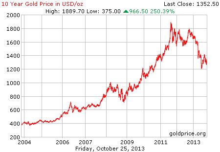 2013年8月底,金价为每盎司$1394.75美元。