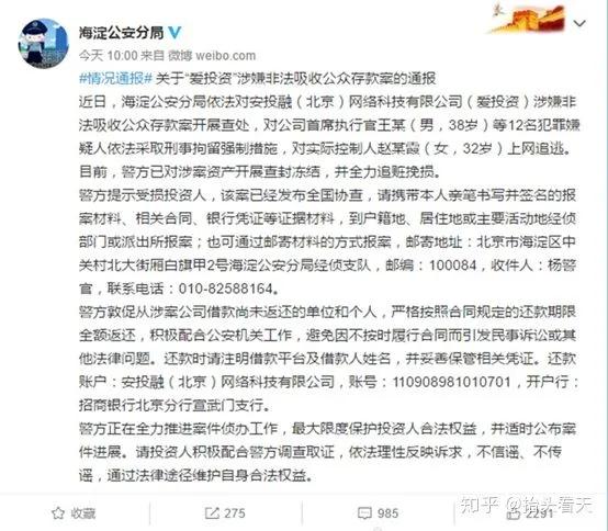 刚刚,北京市海淀公安分局发布通报:该局依法对安投融(北京)网络科技有限公司(爱投资),涉嫌非法吸收公众存款案开展查处,对公司首席执行官王某等12名犯罪嫌疑人依法采取刑事拘留强制措施。