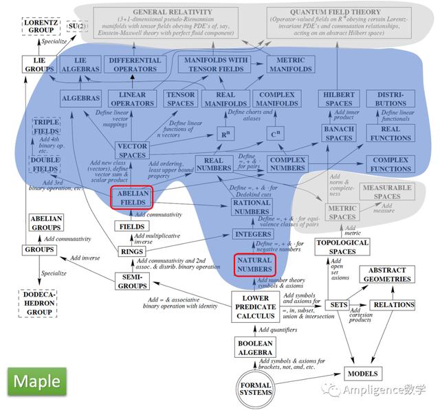 以下3图分别依次展示了Matlab引擎,Maple引擎,与魔数师引擎的理论根基(红色)与应用覆盖范围(蓝色,以及灰色代表不完美覆盖)。