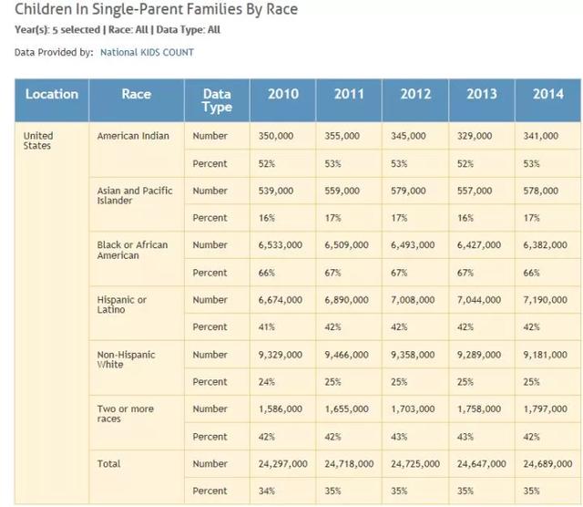 60年代后,黑人单亲家庭的比例也大幅提高,1950年,1/6的黑人孩子是非婚生子,1982年,这一数字上升为57%,1989年,则上升为66%,直到2014年,黑人单亲家庭比例依然为66%,没有丝毫改观。一些最为糟糕的黑人贫民区,甚至4/5的黑人孩子都是非婚生子。